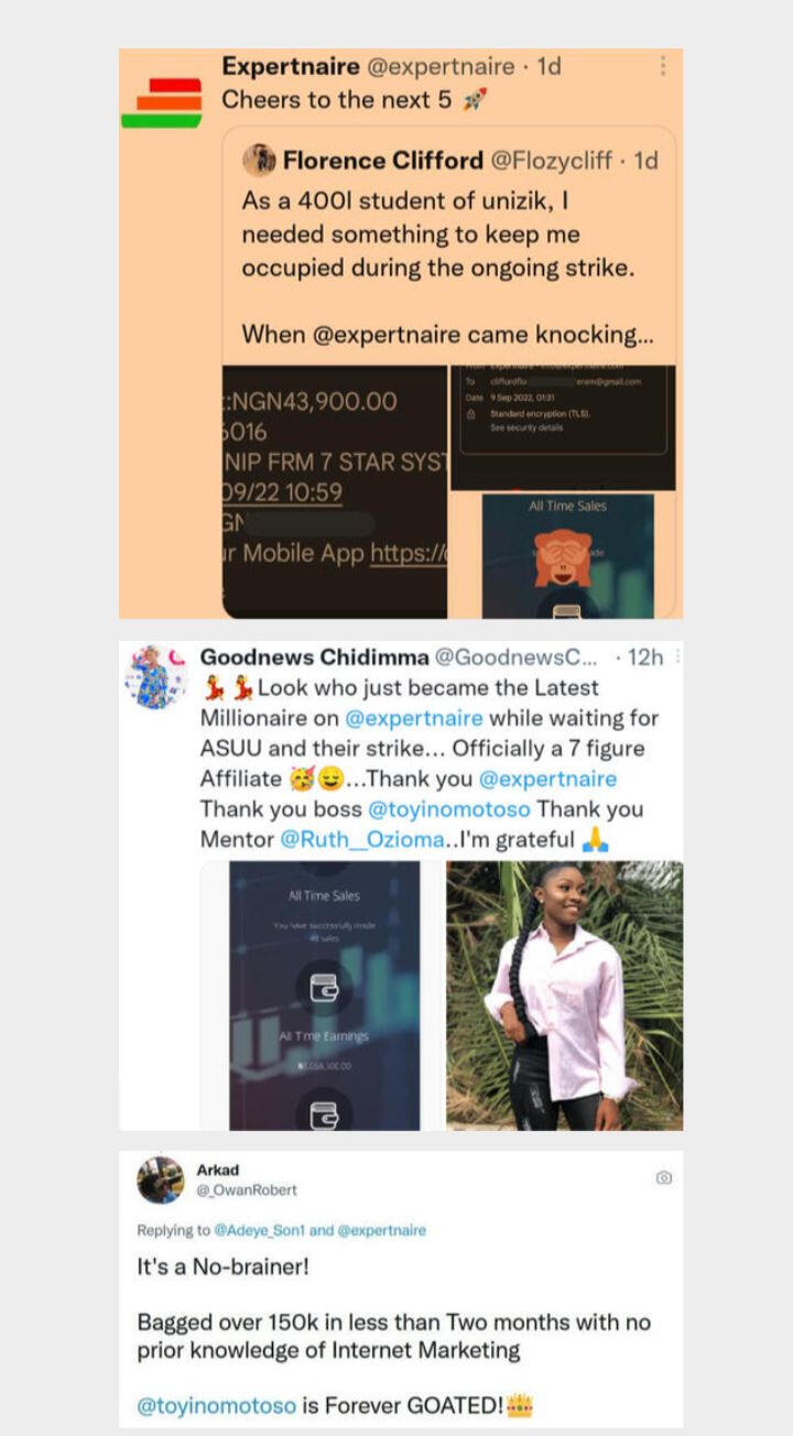 My unique strategy and step-by-step tutorial and mentorship will earn you at least upto 300k monthly, even if you are a beginner an don't have any prior knowledge about affiliate marketing.I Believe you must have heard about affiliate marketing before now or maybe you are just hearing about it for the first time.You are really lucky to be here because I'll be revealing to you the exact blue print that 20% of affiliate marketers are using to make money that 80% do not know and I am here offering to give you access to this blue print, but before then...Below are affiliate marketers that are making up to 6figures within few months?Click the below button for more !
